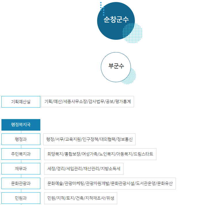 순창군청은 군수 아래에 부군수가 있으며 그 아래의 조직으로는 행정과, 주민복지과, 재무과, 문화관광과, 민원과 등의 부서가 있습니다.