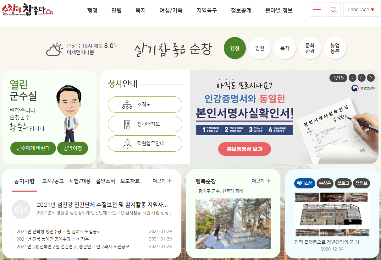 순창군청 홈페이지의 메인 화면입니다. 많은 업무를 수행하는 군청이기 때문에 아주 다양한 메뉴들을 확인하실 수 있습니다. 주요 메뉴로는 행정, 민원, 복지, 여성가족, 지역특구, 정보공개, 분야별정보의 메뉴가 있습니다.