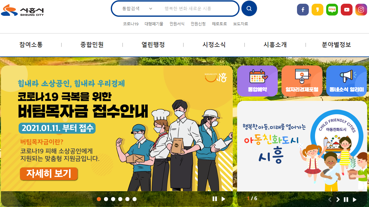 시흥시청을 자세히 살펴보기 위해서는 시흥시청 홈페이지로 접속하시는 것이 가장 빠른 방법입니다. 포털사이트에서 시흥시청을 검색하시면 간편하게 접속을 하실 수가 있습니다.