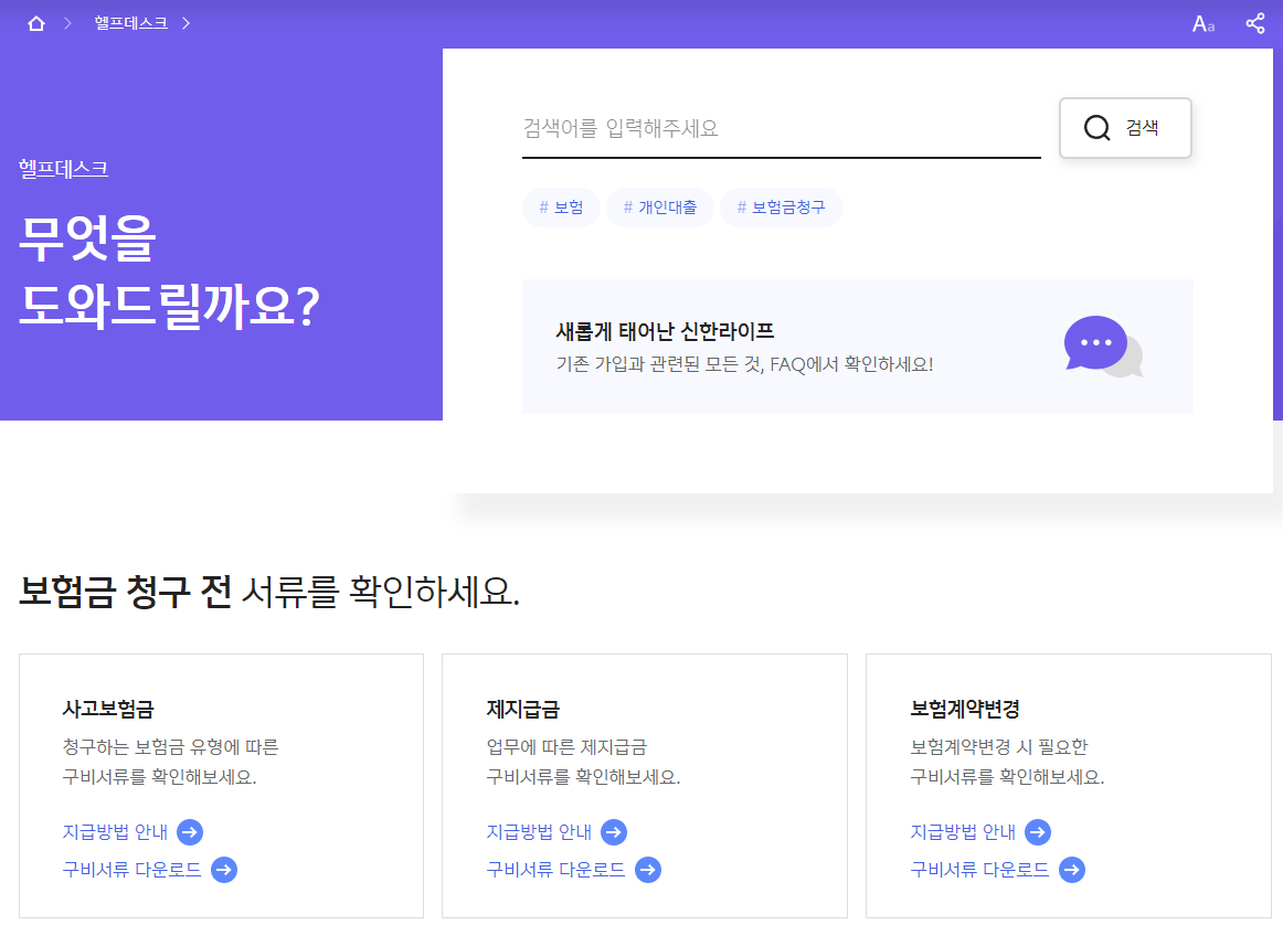 신한라이프, 신한생명의 고객센터 이용안내입니다. 헬프데스크라고 하는 이름으로 고객센터를 운형하고 있습니다. 고객센터에서는 각종 구비서류, 계약고객 서비스, 지점 및 업무 안내 등을 확인할 수 있습니다.