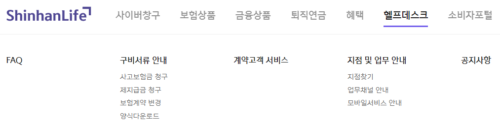 사이버창구, 보험상품, 금융상품, 퇴직연금 혜택, 헬프데스크, 소비자포털이 있습니다. 신기하게도 신한라이프의 고객센터는 헬프데스크로 되어 있습니다.