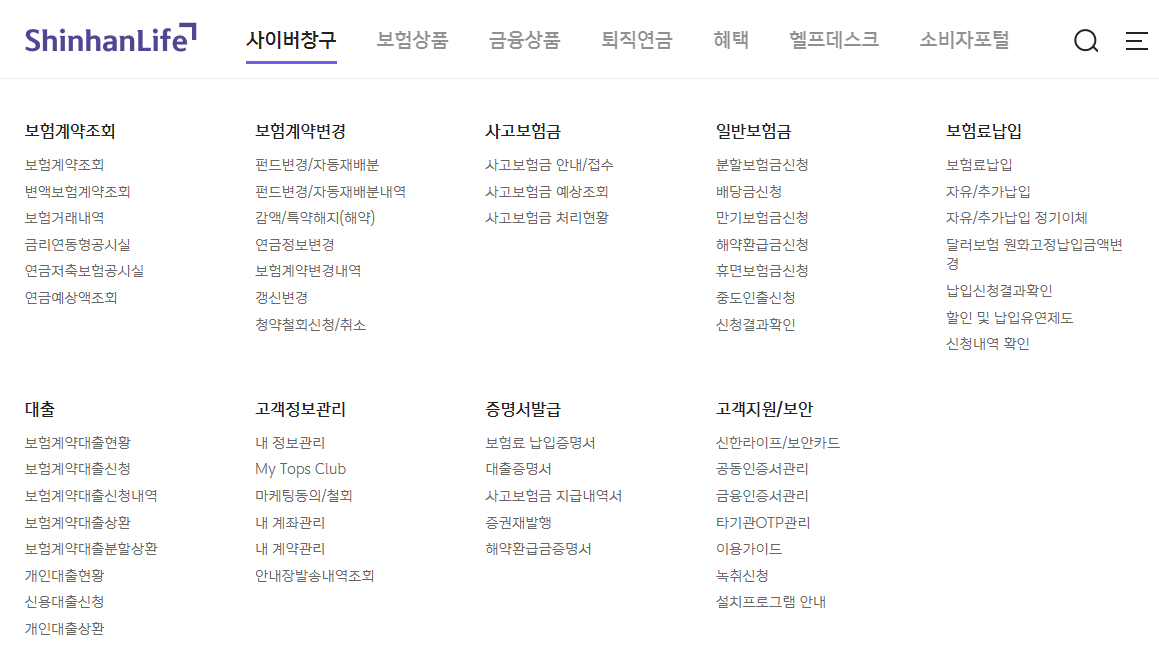 - 대출 : 보험계약대출현황, 보험계약대출신청, 보험계약대출상환