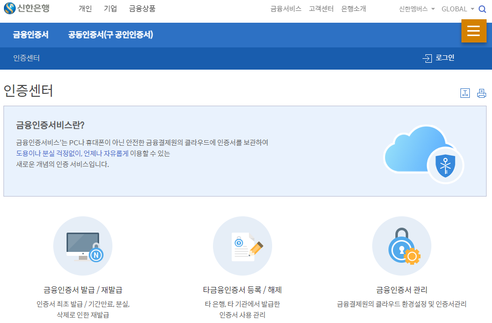 인증센터를 눌러주시면 신한은행 인증센터 페이지로 이동을 합니다. 이제는 공인인증서가 없어졌기 때문에 신규 발급은 금융인증서로 하셔야 합니다. 금융인증서 발급/재발급, 타금융인증서등록/해제, 금융인증서 관리 메뉴가 있습니다.
