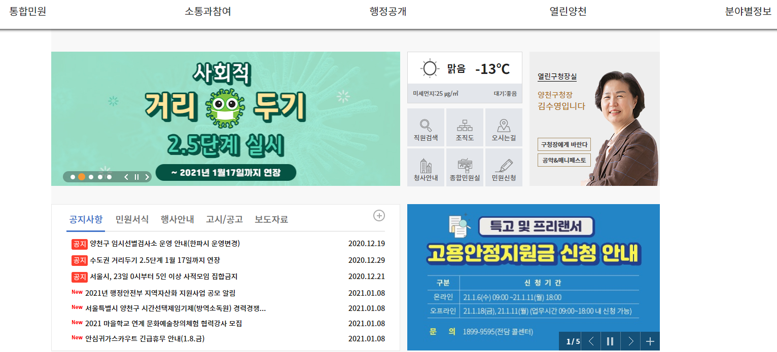 양천구청을 자세히 살펴보기 위해서는 양천구청 홈페이지로 접속하시는 것이 가장 빠른 방법입니다. 포털사이트에서 양천구청을 검색하시면 간편하게 접속을 하실 수가 있습니다.