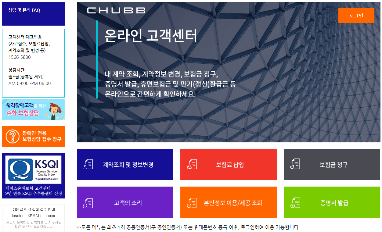 에이스손해보험 고객센터 페이지로 이동을 하면 아래와 같은 화면이 나타납니다. 온라인 고객센터를 통해 내 계약조회, 계약정보 변경, 보험금 청구, 증명서 발급, 휴면보험금 및 만기(갱신) 환급금 등을 확인할 수 있습니다.