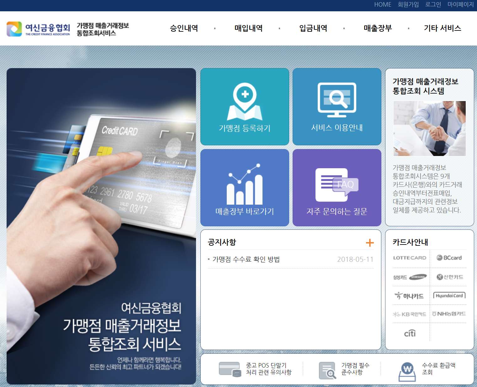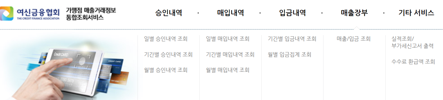여신금융협회 가맹점 매출거래정보 통합조회서비스 홈페이지의 메인화면입니다. 상단의 메뉴에는 승인내역, 매입내역, 입금내역, 매출장부, 기타서비스의 메뉴가 있습니다. 승인내역과, 매입내역에서 카드매출조회가 가능합니다.