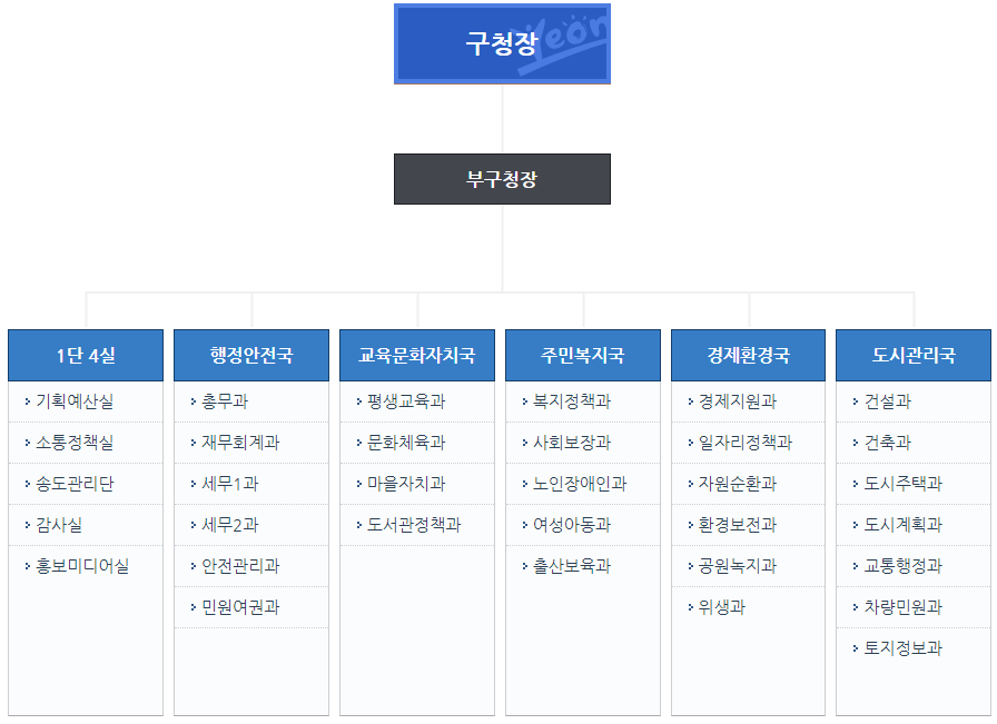 연수구청은 구청장 아래에 부구청장이 있으며 그 아래의 조직으로는 행정관리국, 기획재정국, 생활복지국, 도시관리국, 건설안전교통국, 보건소 등의 부서가 있습니다.