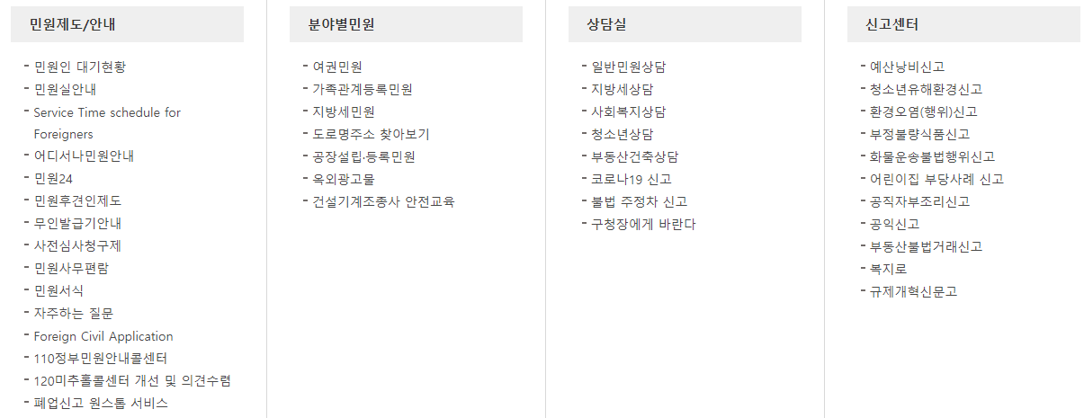 민원 관련 세부 메뉴들을 살펴보면 다음과 같습니다. 또한 전화번호 안내, 업무 및 직원검색, 조직도, 청사안내 등의 바로가기 메뉴를 알아보겠습니다.