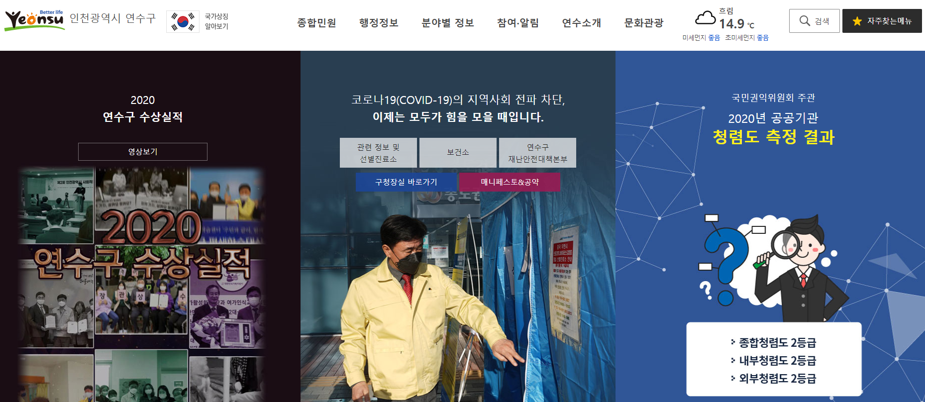 연수구청 홈페이지의 메인 화면입니다. 많은 업무를 수행하는 구청이기 때문에 아주 다양한 메뉴들을 확인하실 수 있습니다. 주요 메뉴로는 종합민원, 행정정보, 분야별정보, 참여/알림, 연수소개, 문화관광의 메뉴가 있습니다.