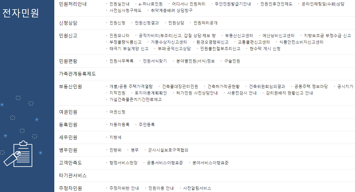 민원 관련 세부 메뉴들을 살펴보면 다음과 같습니다. 또한 전화번호 안내, 업무 및 직원검색, 조직도, 청사안내 등의 바로가기 메뉴를 알아보겠습니다.