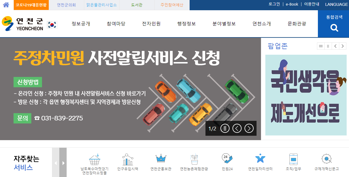 연천군청 홈페이지의 메인 화면입니다. 많은 업무를 수행하는 군청이기 때문에 아주 다양한 메뉴들을 확인하실 수 있습니다. 주요 메뉴로는 민원창구, 구민참여, 행정정보, 우리구소개, 분야별정보, 문화관광의 메뉴가 있습니다.