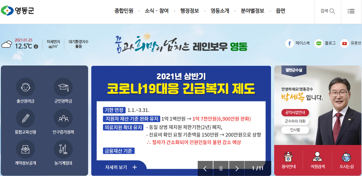 영동군청을 자세히 살펴보기 위해서는 영동군청 홈페이지로 접속하시는 것이 가장 빠른 방법입니다. 포털사이트에서 영동군청을 검색하시면 간편하게 접속을 하실 수가 있습니다.