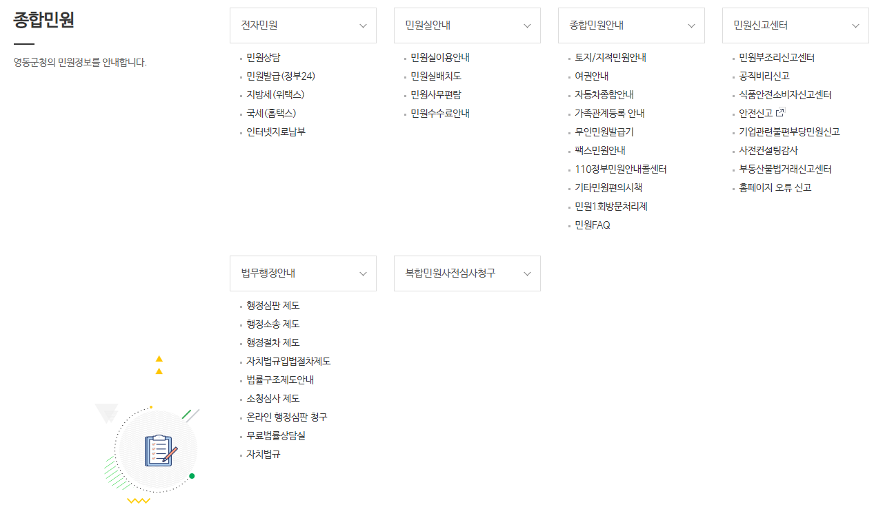민원 관련 세부 메뉴들을 살펴보면 다음과 같습니다. 또한 전화번호 안내, 업무 및 직원검색, 조직도, 청사안내 등의 바로가기 메뉴를 알아보겠습니다.