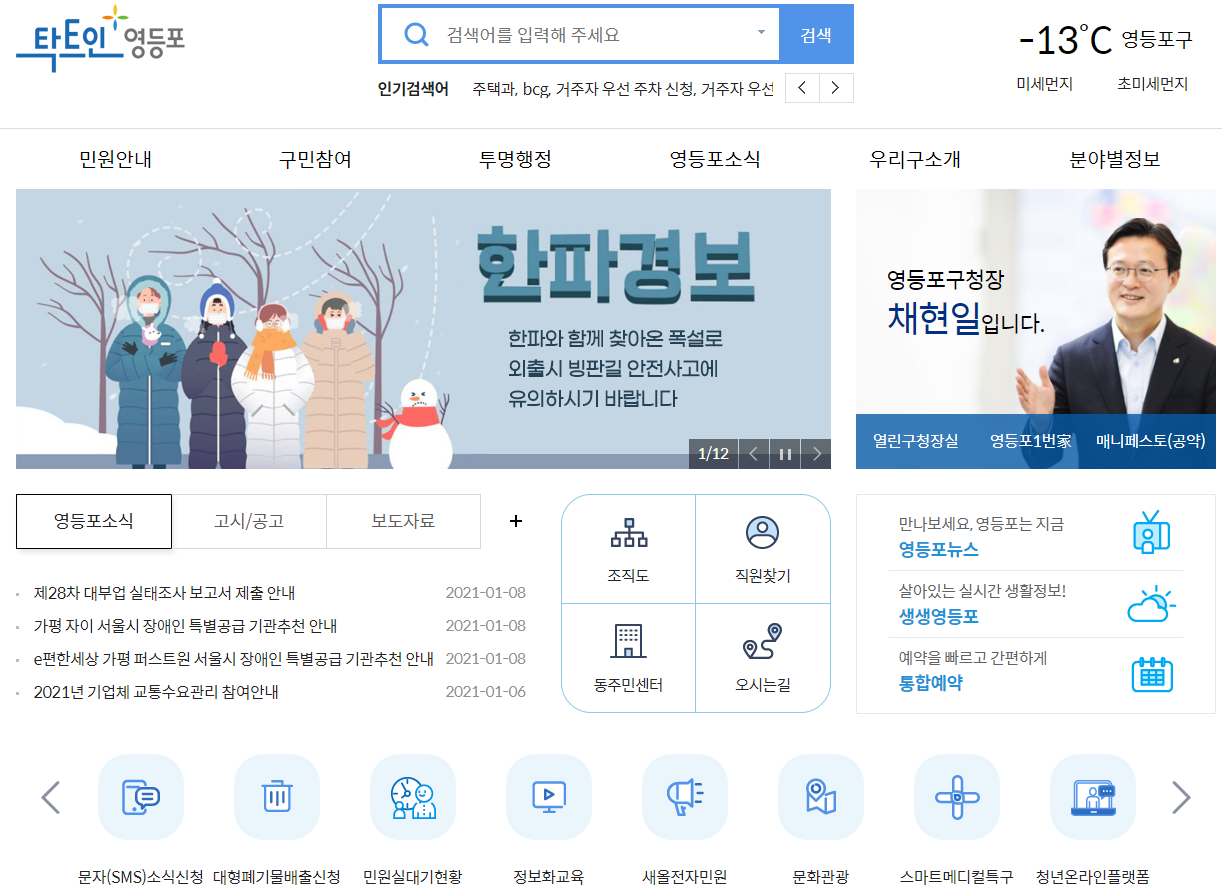 영등포구청 홈페이지의 메인 화면입니다. 많은 업무를 수행하는 구청이기 때문에 아주 다양한 메뉴들을 확인하실 수 있습니다. 주요 메뉴로는 민원안내, 구민참여, 투명행정, 영등포소식, 우리구소개, 분야별정보의 메뉴가 있습니다.