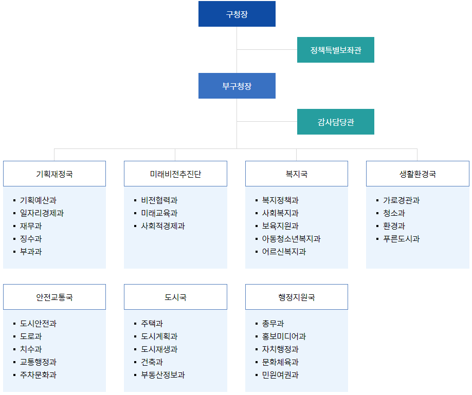 영등포구청은 구청장 아래에 부구청장이 있으며 그 아래의 조직으로는 기획재정국, 미래비전추진단, 복지국, 생활환경국, 안전교통국, 도시국, 행정지원국 등의 부서가 있습니다.