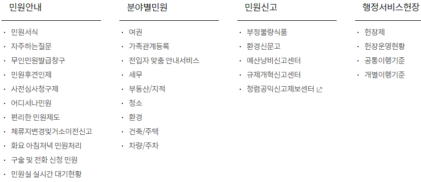 세부 메뉴들을 살펴보면 다음과 같습니다. 많은 분들이 이용하실 민원메뉴는 가장 좌측에 위치하고 있습니다. 또한 전화번호 안내, 업무 및 직원검색, 조직도, 청사안내 등의 바로가기 메뉴를 알아보겠습니다.