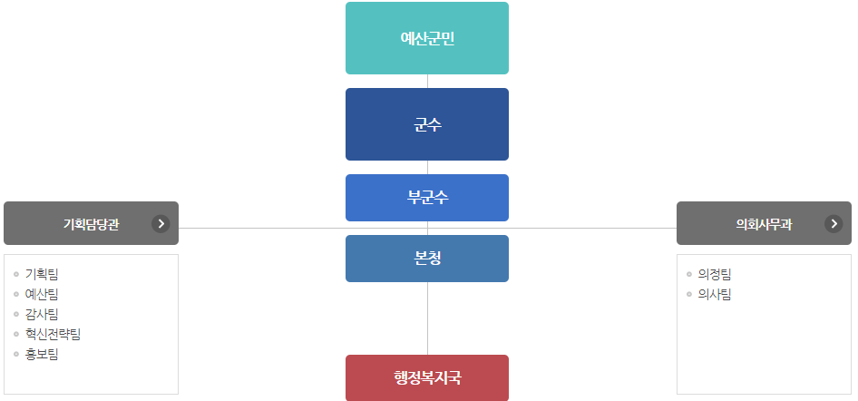 예산군청은 군수 아래에 부군수가 있으며 그 아래의 조직으로는 행정복지국, 산업건설국, 직속기관, 사업도 등의 부서가 있습니다.
