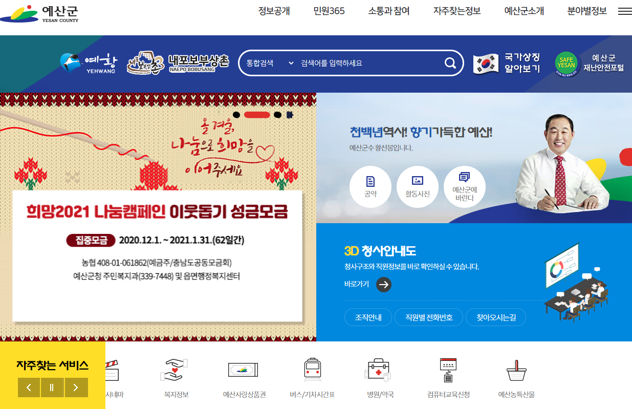 예산군청 홈페이지의 메인 화면입니다. 많은 업무를 수행하는 군청이기 때문에 아주 다양한 메뉴들을 확인하실 수 있습니다. 주요 메뉴로는 정보공개, 민원365, 소통과참여, 자주찾는정보 등의 메뉴가 있습니다.