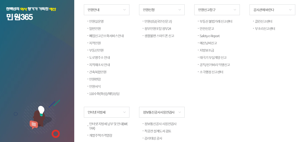 민원 관련 세부 메뉴들을 살펴보면 다음과 같습니다. 또한 전화번호 안내, 업무 및 직원검색, 조직도, 청사안내 등의 바로가기 메뉴를 알아보겠습니다.