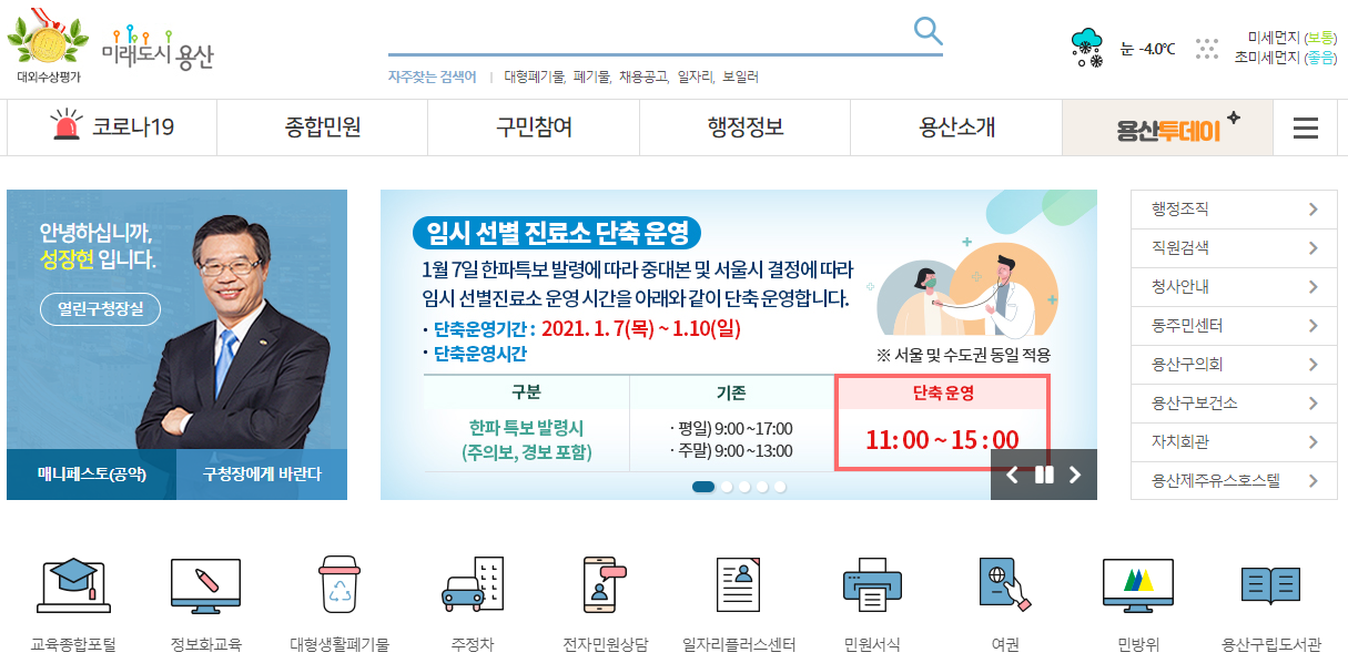 교육종합포털, 정보화교육, 대형생활폐기물, 주정차, 전자민원상담, 일자리플러스센터, 민원서식, 여권, 민방귀, 용산구립도서관