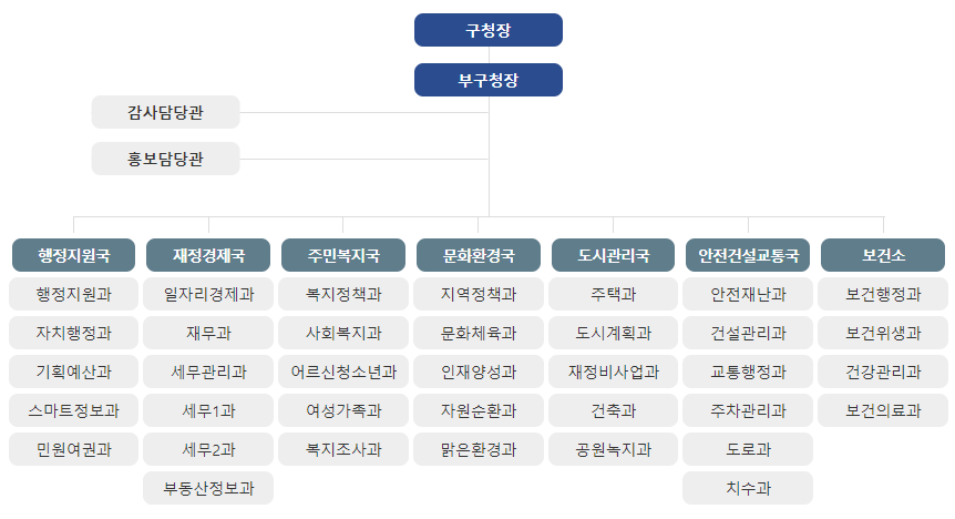 구청장실 부구청장실 행정지원국장실 행정지원과 직소민원실 감사담당관 공직자윤리위원회 직소민원실 감사장 중회의실 정책회의실 영상회의실 여직원휴게실 구정연구단