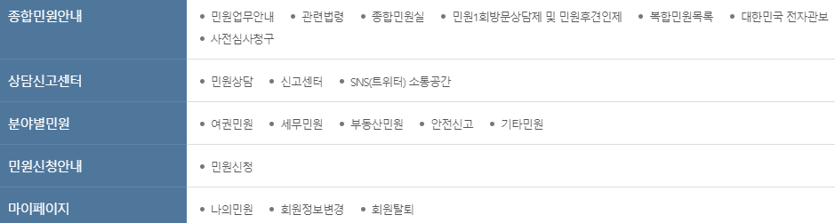 분야별민원 여권민원 세무민원 부동산민원 안전신고기타민원