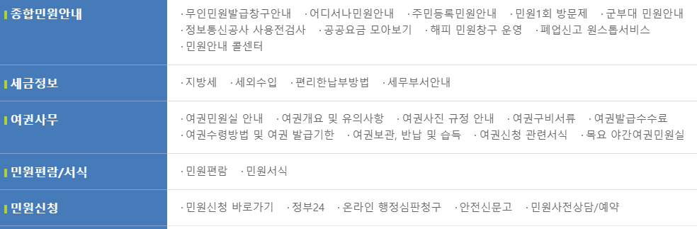 민원 관련 세부 메뉴들을 살펴보면 다음과 같습니다. 또한 전화번호 안내, 업무 및 직원검색, 조직도, 청사안내 등의 바로가기 메뉴를 알아보겠습니다.