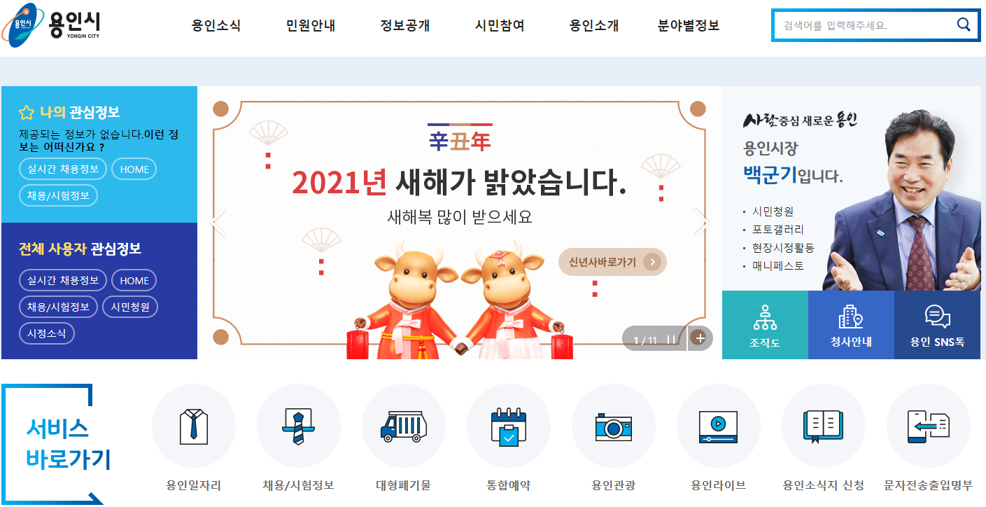 용인시청을 자세히 살펴보기 위해서는 용인시청 홈페이지로 접속하시는 것이 가장 빠른 방법입니다. 포털사이트에서 용인시청을 검색하시면 간편하게 접속을 하실 수가 있습니다.