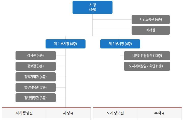 시청 조직도 제1부시장(4층) - 감사관(4층),공보관(3층),정책기획관(4층),법무담당관(7층),청년담당관(3층)