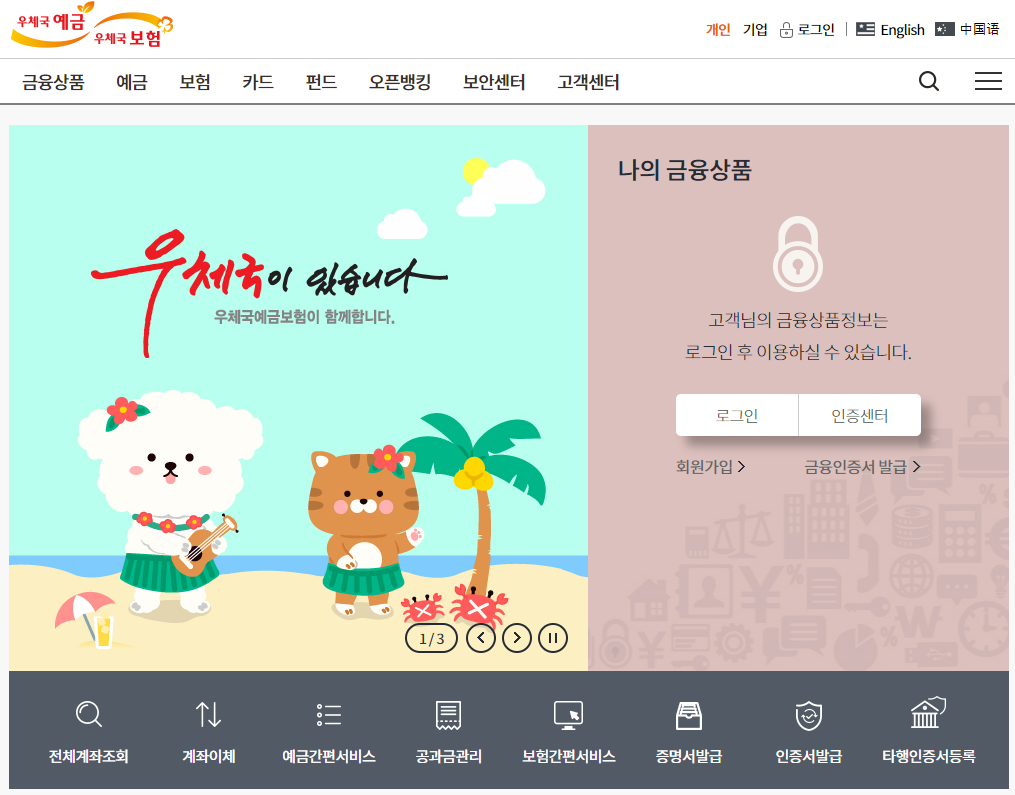 인터넷에 우체국을 검색하면 금융홈페이지보다 우편관련 홈페이지가 먼저 나오는 것을 보게 됩니다. 우체국이라서 눌러보면 택배와 배송에 관련된 홈페이지일 것입니다. 우체국은행 또는 우체국예금, 우체국보험 등으로 검색을 하셔야 금융홈페이지로 접속을 할 수 있습니다.