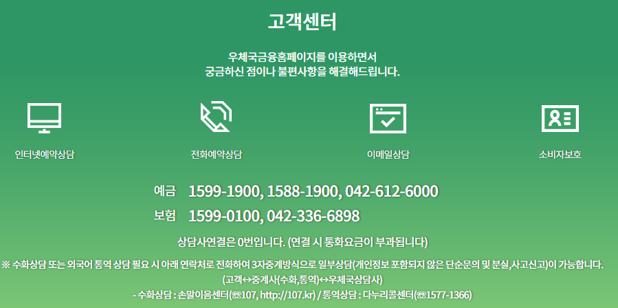 우체국 창구를 직접 방문하는 것이 아니라 인터넷으로 업무를 보다보면 고객센터를 통해 상담을 해야 하는 경우도 있습니다. 이럴 때는 우체국 고객센터 홈페이지를 참고하면 도움이 됩니다.