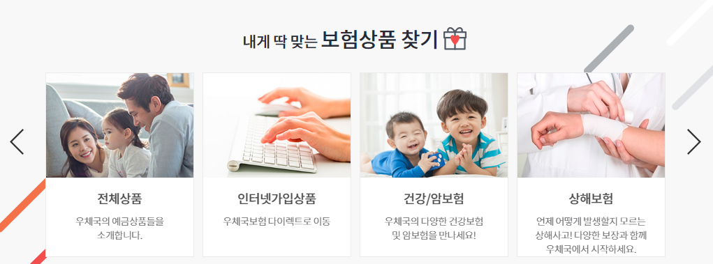 화면을 조금 더 아래로 내리면 아래와 같이 4개의 주요 상품 찾기 메뉴가 있습니다. 우체국의 예금상품, 인터넷가입상품, 우체국의 다양한 건강보험 및 암보험, 상해사고에 대비할 수 있는 상해보험으로 구분을 해두고 있습니다.