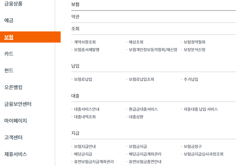 홈페이지로 접속을 하셨다면 보험관련 업무를 보기 위해서는 상단에 있는 금융상품, 예금, 보험, 카드, 펀드, 오픈뱅킹, 보안센터, 고객센터 메뉴중에서 보험메뉴를 선택해야 합니다.