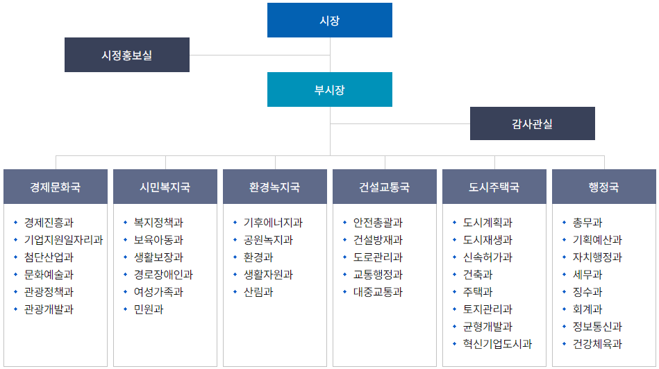 원주시청은 시장 아래에 부시장이 있으며 그 아래의 조직도로는 경제문화국, 시민복지국, 환경녹지국, 건설교통국, 도시주택국, 행정국 등의 부서가 있습니다.