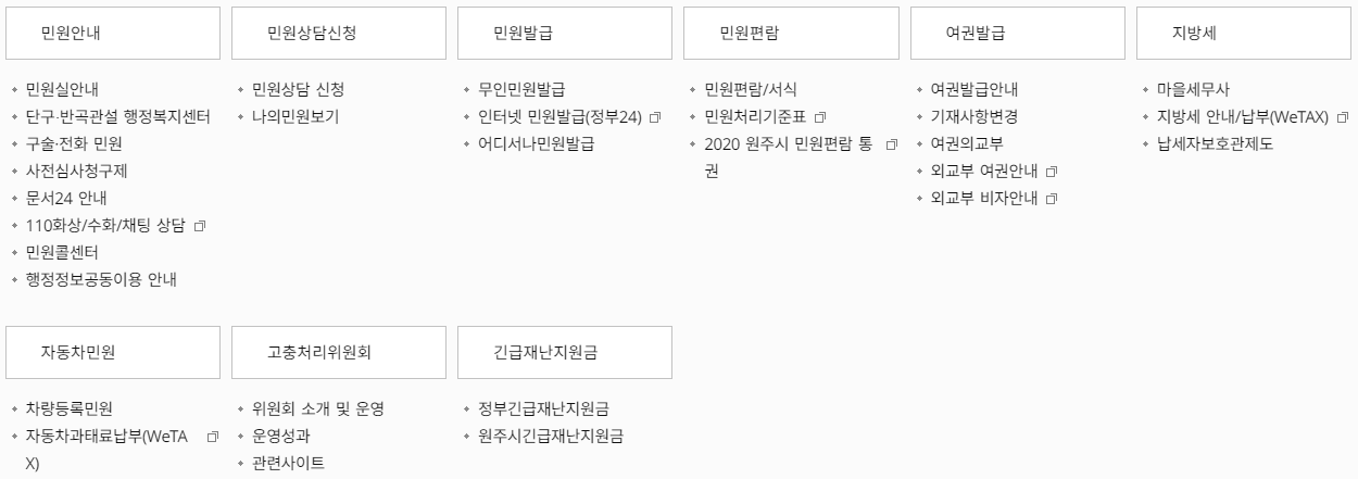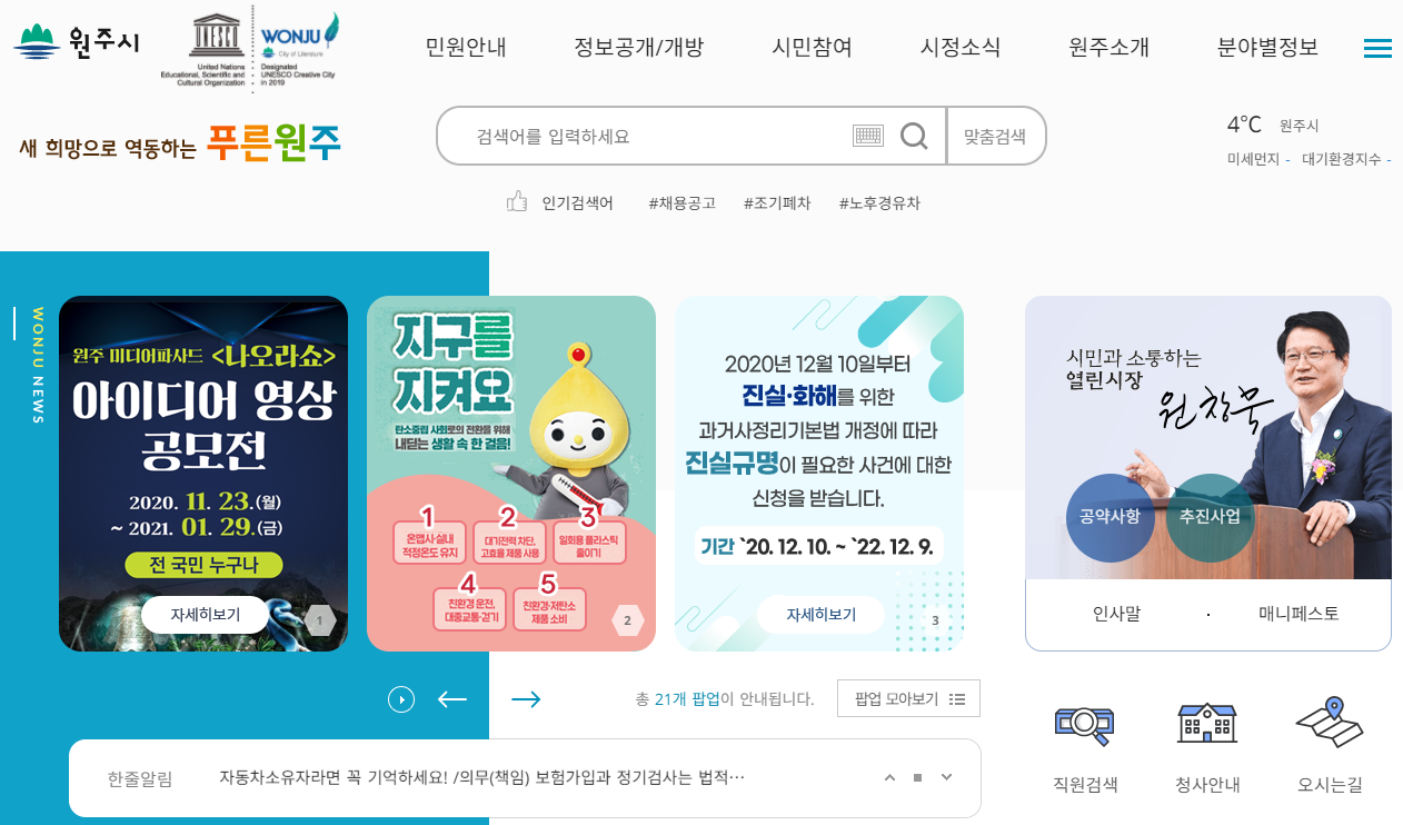 여기까지 원주시청 홈페이지에서 제공하는 정보들에 대해 간단히 살펴보았습니다. 시청 업무를 보시기 전에 미리 확인하시고 방문하시면 아주 많은 도움이 될 것입니다.