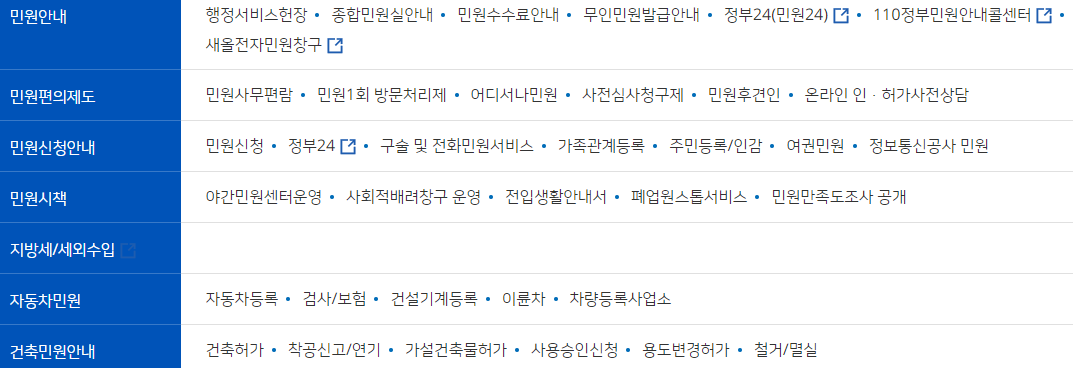 행정서비스헌장 종합민원실안내 민원수수료안내 무인민원발급안내 정부24(민원24) 110정부민원안내콜센터 새올전자민원창구