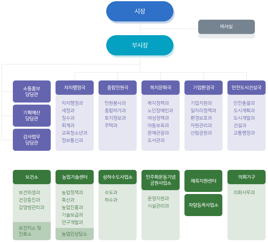 이천시청은 시장 아래에 부시장이 있으며 그 아래의 조직으로는 자치행정국, 종합민원국, 복지문화국, 기업환경국, 안전도시건설국 등의 부서가 있습니다.