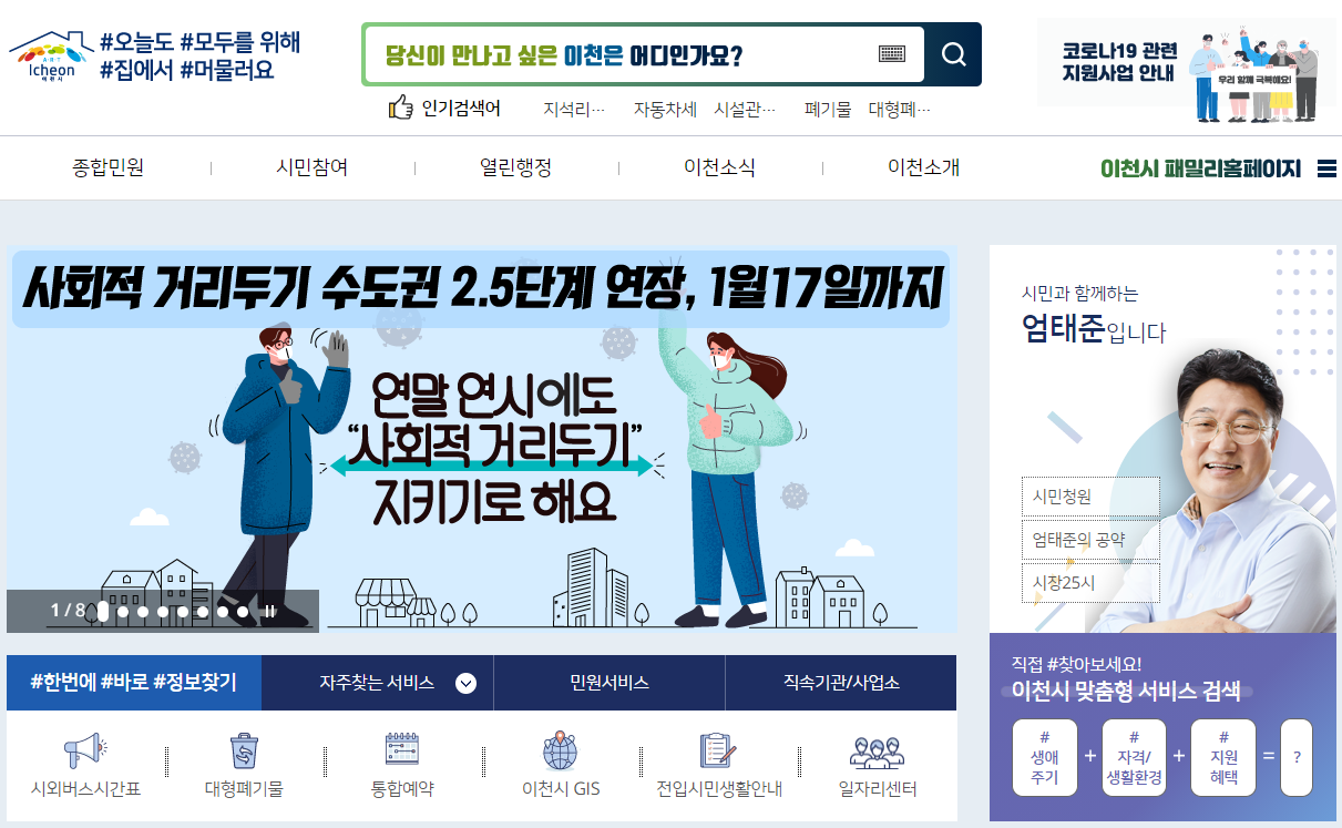 이천시청을 자세히 살펴보기 위해서는 이천시청 홈페이지로 접속하시는 것이 가장 빠른 방법입니다. 포털사이트에서 이천시청을 검색하시면 간편하게 접속을 하실 수가 있습니다.