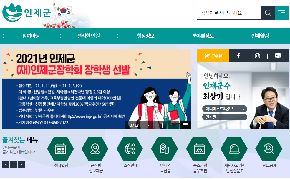 인제군청을 자세히 살펴보기 위해서는 인제군청 홈페이지로 접속하시는 것이 가장 빠른 방법입니다. 포털사이트에서 인제군청을 검색하시면 간편하게 접속을 하실 수가 있습니다.