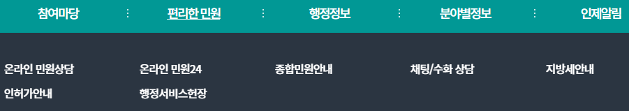 민원 관련 세부 메뉴들을 살펴보면 다음과 같습니다. 또한 전화번호 안내, 업무 및 직원검색, 조직도, 청사안내 등의 바로가기 메뉴를 알아보겠습니다.