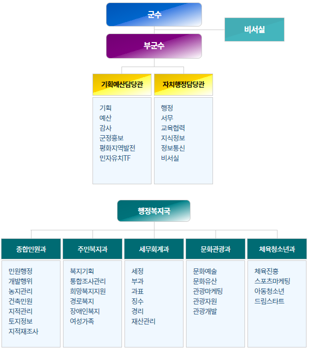 인제군청은 군수 아래에 부군수가 있으며 그 아래의 조직으로는 종합민원과, 주민복지과, 세무회계과, 문화관광과, 체육청소년과, 경제협력과, 환경보호과, 산림자원과 등의 부서가 있습니다.
