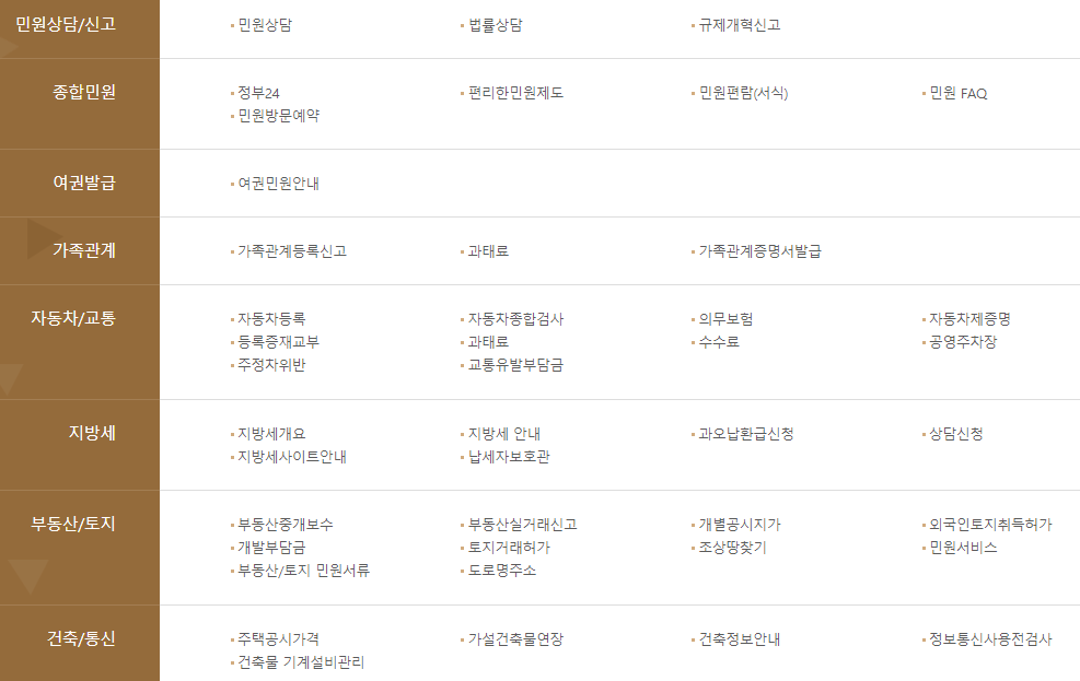 민원 관련 세부 메뉴들을 살펴보면 다음과 같습니다. 또한 전화번호 안내, 업무 및 직원검색, 조직도, 청사안내 등의 바로가기 메뉴를 알아보겠습니다.