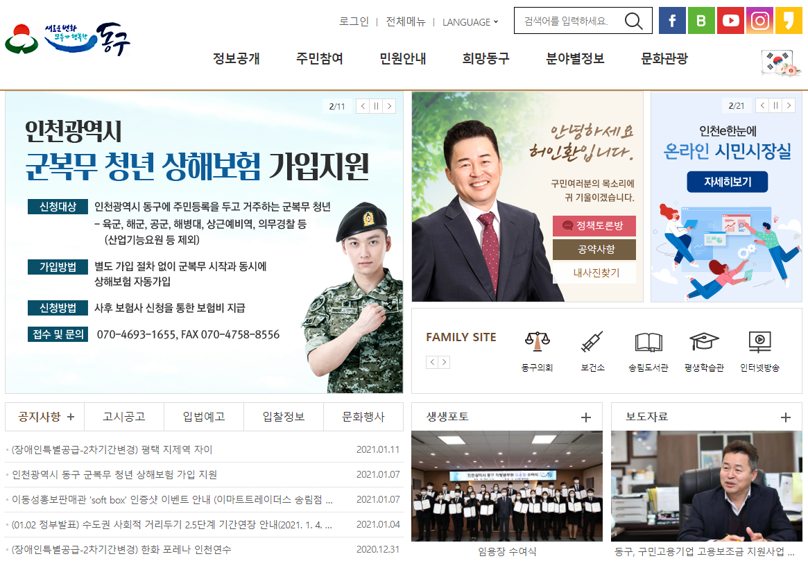 동구청을 자세히 살펴보기 위해서는 동구청 홈페이지로 접속하시는 것이 가장 빠른 방법입니다. 포털사이트에서 동구청을 검색하시면 간편하게 접속을 하실 수가 있습니다.
