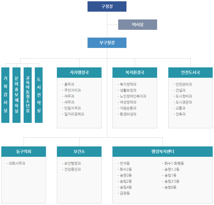 동구청은 구청장 아래에 부구청장이 있으며 그 아래의 조직으로는 자치행정국, 복지환경국, 안전도시국, 동구의회, 보건소 등의 부서가 있습니다.
