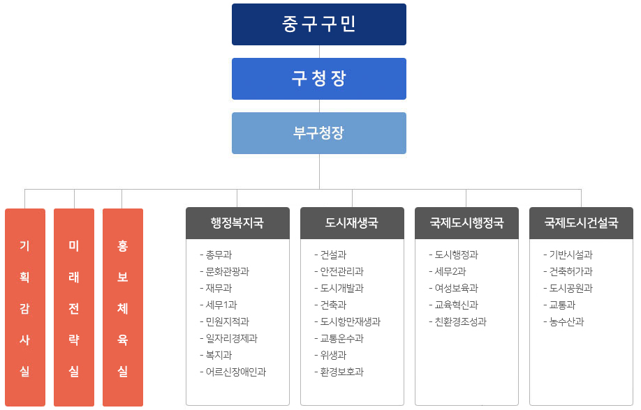 중구청은 구청장 아래에 부구청장이 있으며 그 아래의 조직으로는 행정복지국, 도시재생국, 국제도시행정국, 국제도시건설국 등의 부서가 있습니다.