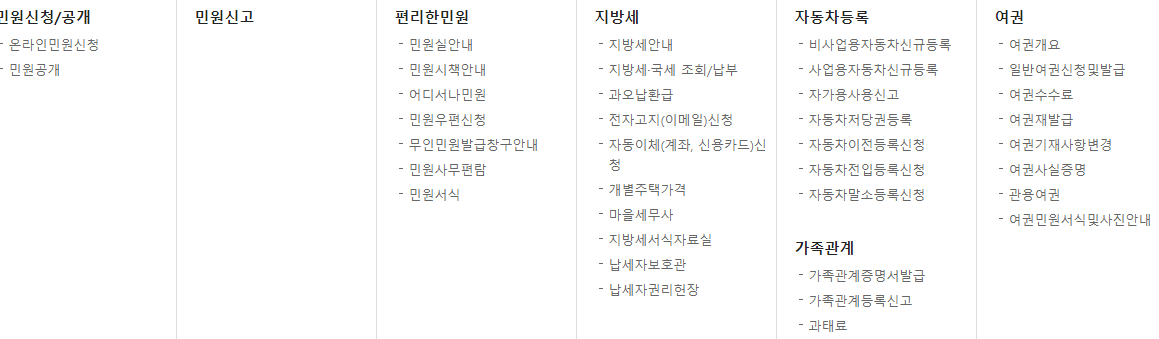 민원 관련 세부 메뉴들을 살펴보면 다음과 같습니다. 또한 전화번호 안내, 업무 및 직원검색, 조직도, 청사안내 등의 바로가기 메뉴를 알아보겠습니다.
