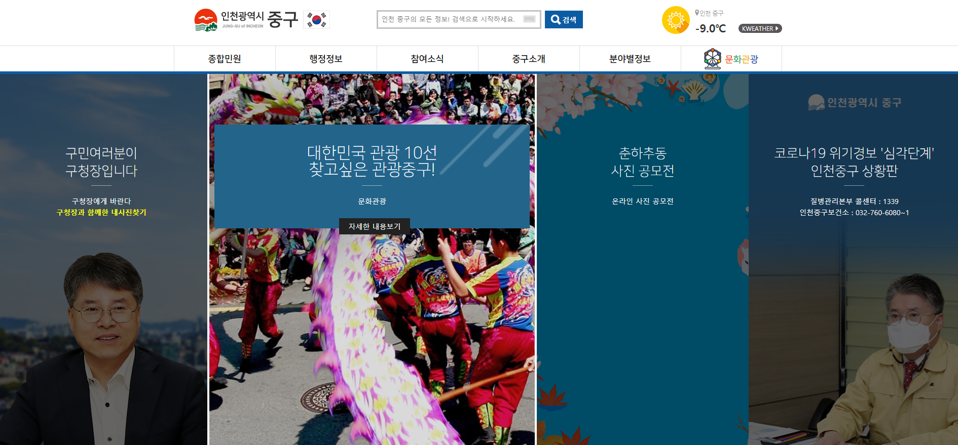 인천 중구청을 자세히 살펴보기 위해서는 중구청 홈페이지로 접속하시는 것이 가장 빠른 방법입니다. 포털사이트에서 중구청을 검색하시면 간편하게 접속을 하실 수가 있습니다.