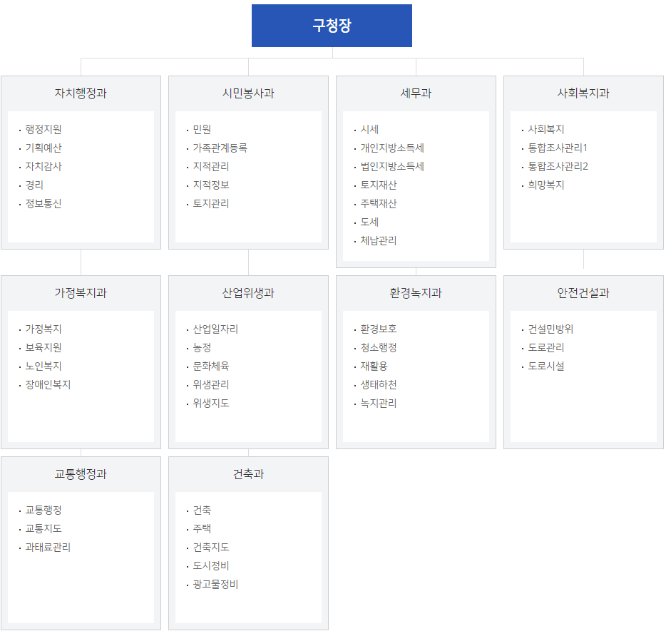 일산동구청은 구청장 아래에 자치행정과, 시민봉사과, 세무과, 사회복지과, 가정복지과, 산업위생과, 환경녹지과, 안전건설과, 교통행정과, 건축과 등의 부서가 있습니다.