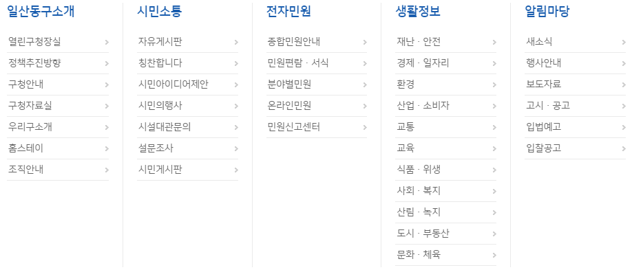 일산동구청 홈페이지의 메인 화면입니다. 많은 업무를 수행하는 구청이기 때문에 아주 다양한 메뉴들을 확인하실 수 있습니다. 주요 메뉴로는 민원창구, 구민참여, 행정정보, 우리구소개, 분야별정보, 문화관광의 메뉴가 있습니다.