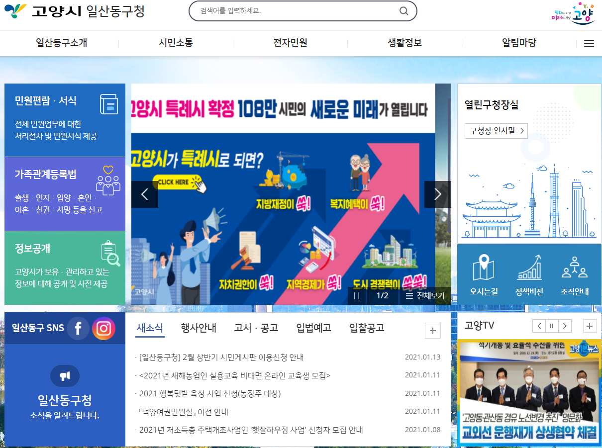 일산동구청을 자세히 살펴보기 위해서는 일산동구청 홈페이지로 접속하시는 것이 가장 빠른 방법입니다. 포털사이트에서 일산동구청을 검색하시면 간편하게 접속을 하실 수가 있습니다.